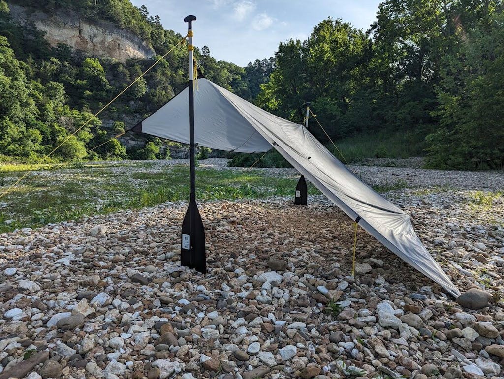 You can pitch the tarp with trekking poles, trees, or paddles, using the reinforced guy-out points and included line-locs.